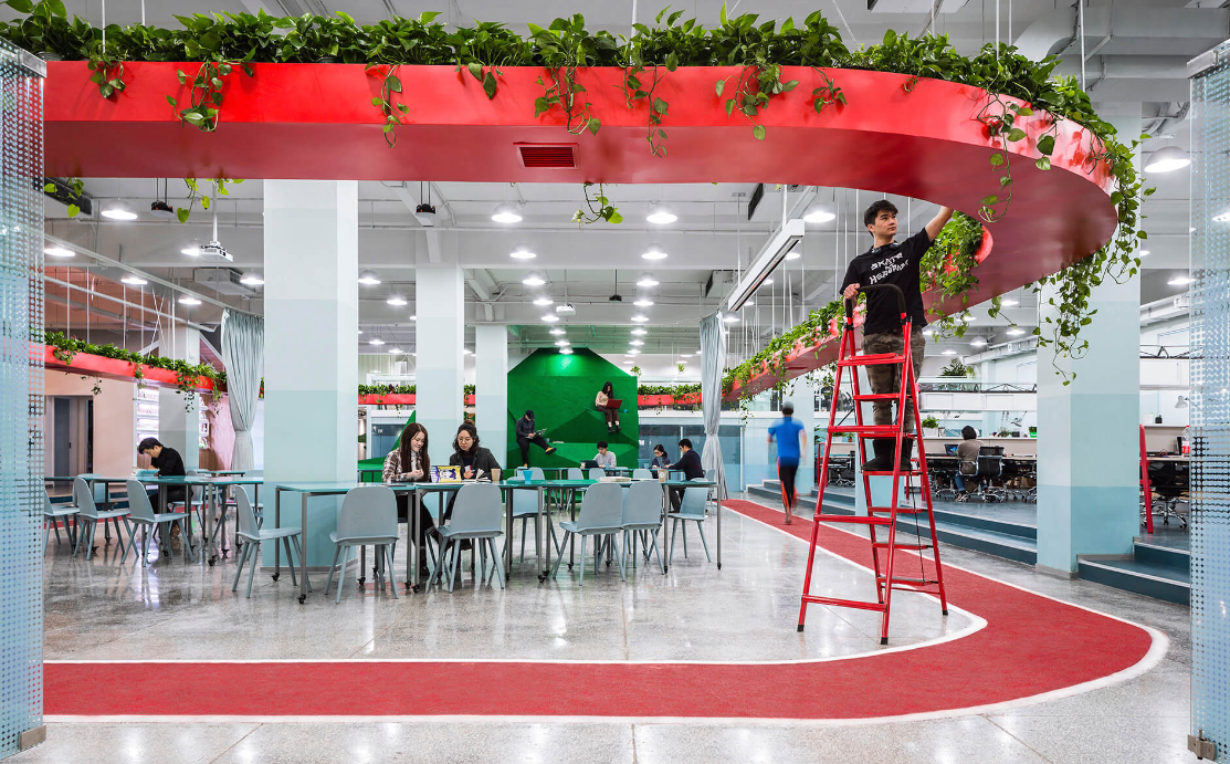 辦公室裝修設計上,用一個中間懸掛的“紅環(huán)”聯(lián)系在一起,紅環(huán)上種植蔬菜與植物,下面對應的是跑道。員工在跑道健步的同時可以打電話,也可以與照料植物的同事進行交談。