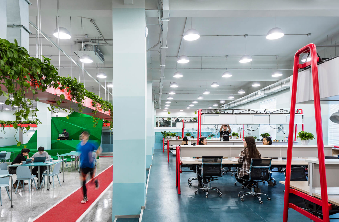 懸掛在天花板上的是綠化植物環(huán),其設計中融入了先進的空氣過濾系統(tǒng),實時的空氣數(shù)據(jù)會在跑道上的屏幕中顯示,工作人員能夠隨時監(jiān)控并調整室內空氣的質量。辦公室裝修