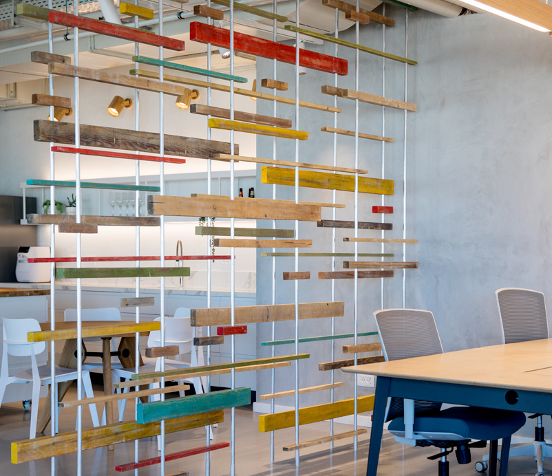 整個辦公室裝修設(shè)計中,最獨特的莫過了這個隔斷墻的設(shè)計了,說是隔斷,也是斷非斷的感覺,采用多種不同規(guī)格、不同長短、不同寬度的木條,再涂上不同的顏色,有著相互碰撞感,也增添了一絲活力,遠遠看去就像一柵格窗簾,奇妙又好看。