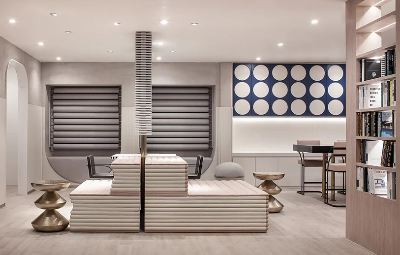 三樓是針對(duì)年輕群體的小型工作空間。從大堂乘坐自動(dòng)扶梯到達(dá)3樓后,首先會(huì)有人在展示窗口上用“努力工作”的字眼表示歡迎。x + living利用空間中的健身器材元素來(lái)傳達(dá)保持健康和工作之間平衡的想法。設(shè)計(jì)融合了有趣的特色,如開(kāi)放式酒吧區(qū)和前臺(tái)側(cè)面的休閑球池。穿過(guò)接待區(qū),人們將來(lái)到共用會(huì)議室和電話亭形的休息室。會(huì)議室采用簡(jiǎn)約設(shè)計(jì),休息室采用暖色調(diào)裝飾,配有柔軟的座椅和壁墊。