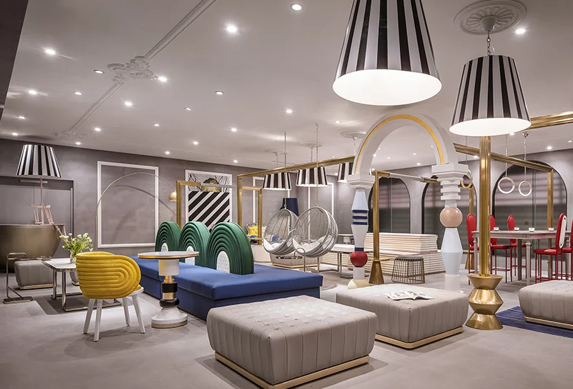 二樓,2樓,作為用餐空間。重點(diǎn)放在走廊末端區(qū)域的設(shè)計(jì)上,使用彩色背景墻以及與餐廳相關(guān)的有趣家具和裝置。