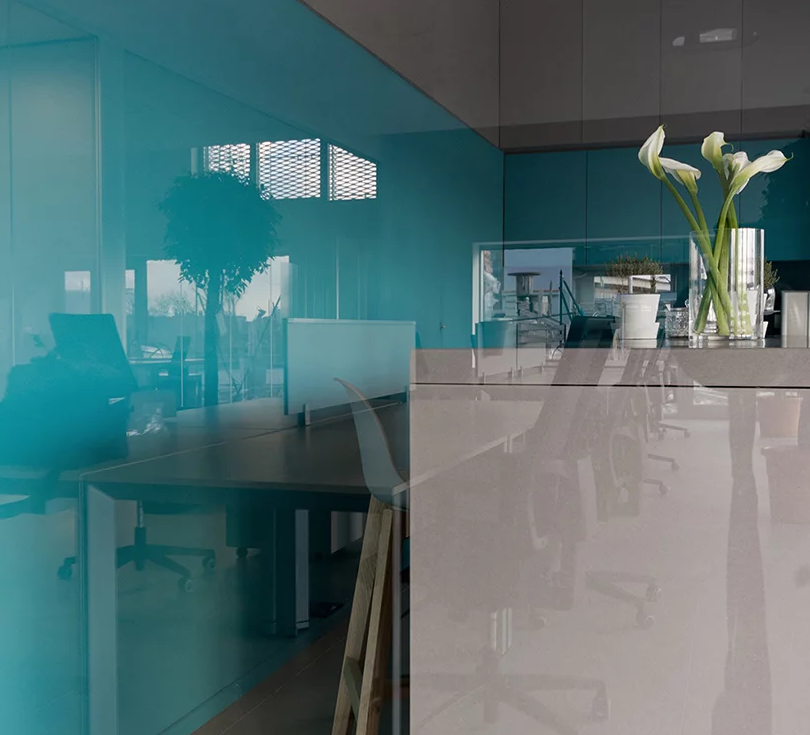 辦公室裝修設計中部分采用了光滑又帶有反射的材料。