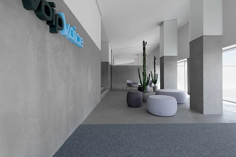 3.辦公室裝修設計通過在立面上使用相同的材??料,比喻回憶起數(shù)字網(wǎng)絡關注voipvoice的業(yè)務和當代社會的引擎。