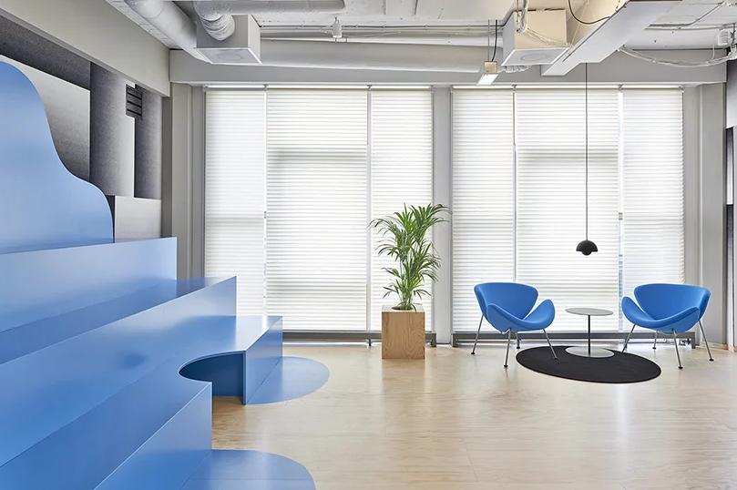 另外辦公室裝修中定制的印花地毯,固定在墻上的矩形漸變,反映了設計師對當代城市景觀天際線的詮釋。辦公室裝修所定制家具與現(xiàn)有家具相結(jié)合,營造出私密的空間,強調(diào)彩色雕塑與天然植物的有機結(jié)合。