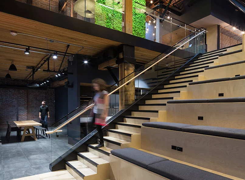 總部分三個層次組織,通過一個雄心勃勃的建筑植入物連接起來,建立一系列相互關(guān)聯(lián)的不同類型的集合空間,以支持一系列社會活動,包括一個雙高空間,設(shè)有方便的樓梯和梯級座位,以便利“全員”會議和演講,以及非正式聚會(連接所有三層樓);辦公室裝修設(shè)計有一個廚房/濃縮咖啡吧/雞尾酒吧區(qū),以容納團隊午餐和社交聚會(三樓);咖啡站(一樓和二樓);開放就餐區(qū)(二樓);休息室/媒體室(一樓);各種大小的會議室(所有樓層)。