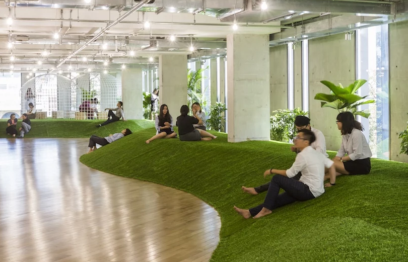 辦公室裝修設(shè)計(jì)當(dāng)中工作區(qū)域與窗戶保持一定距離時(shí),其周邊被設(shè)計(jì)成放松的綠色輪廓。起伏的草坪可以作為活動(dòng)、休息和放松的地方,或者在更親密的氣氛中舉行會(huì)議?;畹闹参镎驹诖斑叢蹲焦饩€,同時(shí)給人一種置身于公園或田野的感覺(jué)。在中心,會(huì)議室可以靈活使用,如小的私人房間或由隔斷控制的大房間。