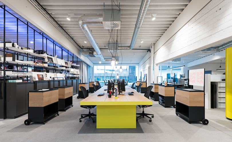 辦公室裝修設(shè)計(jì)有兩個(gè)開(kāi)放式會(huì)議室,其中較大的可以通過(guò)移動(dòng)窗簾分成四個(gè)較小的房間。由阿羅拉松木制成的三個(gè)箱子可用于內(nèi)部會(huì)議或創(chuàng)造安靜的工作區(qū);箱子的正面可以用可調(diào)的木制板條半開(kāi)向房間。存儲(chǔ)2300多個(gè)樣品的材料商店也是集成的。其中一部分可以用Gerriets窗簾分開(kāi)。辦公室裝修是由Knobluch設(shè)計(jì)和生產(chǎn)的家具,另一部分是cor,prestoria,hay,vitra,zeitraum,miinu等產(chǎn)品。