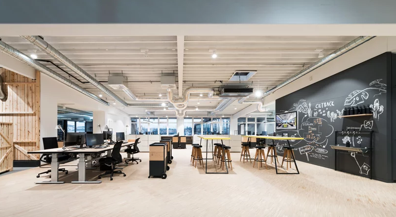 辦公室裝修的拋光涂層下面有地板加熱,這是由自己的廢木材加熱系統(tǒng)。另外還有一個(gè)單獨(dú)的通風(fēng)系統(tǒng),里面有供新鮮空氣使用的熱交換器。冷卻系統(tǒng)使用管道連接和盒式磁帶。墻壁的辦公室裝修部分用阿羅拉松木作鑲板,以隱藏由泡沫和隔音材料制成的隔音材料。蓋里茨的舞臺(tái)窗簾隔音會(huì)議室。辦公室裝修的移動(dòng)隔墻和貼有氈的告示板也可用作隔音。最后,穿孔梯形板天花板也有助于一個(gè)舒適的房間聲學(xué)。