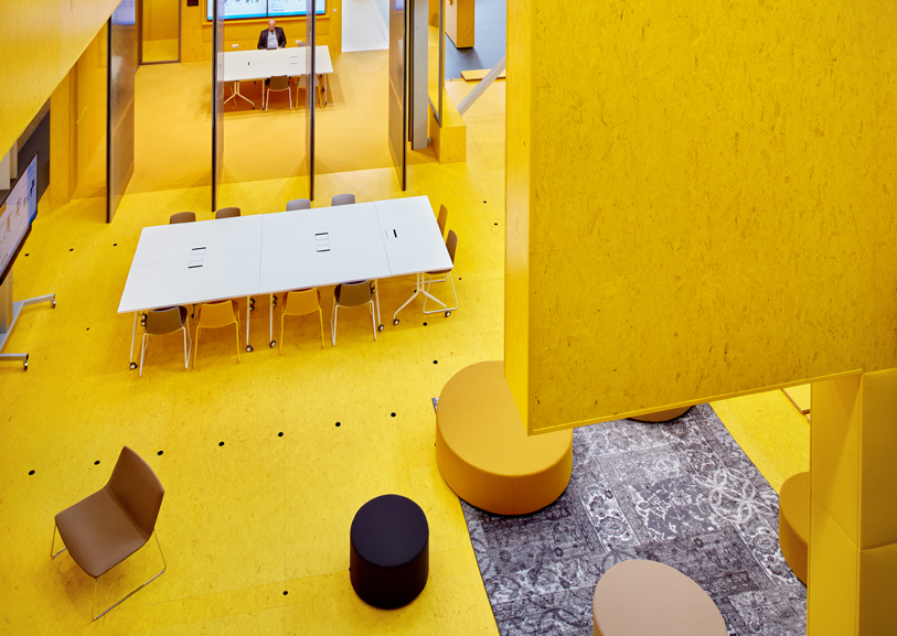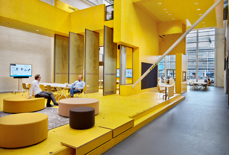 最后的辦公室裝修設(shè)計(jì)靈感來自于建筑實(shí)驗(yàn)家和藝術(shù)家的一件黃色的3D小藝術(shù)品??死锝?middot;德科寧,將大禮堂內(nèi)現(xiàn)有的四個(gè)不同樓層連接起來,為工作提供各種解決方案。