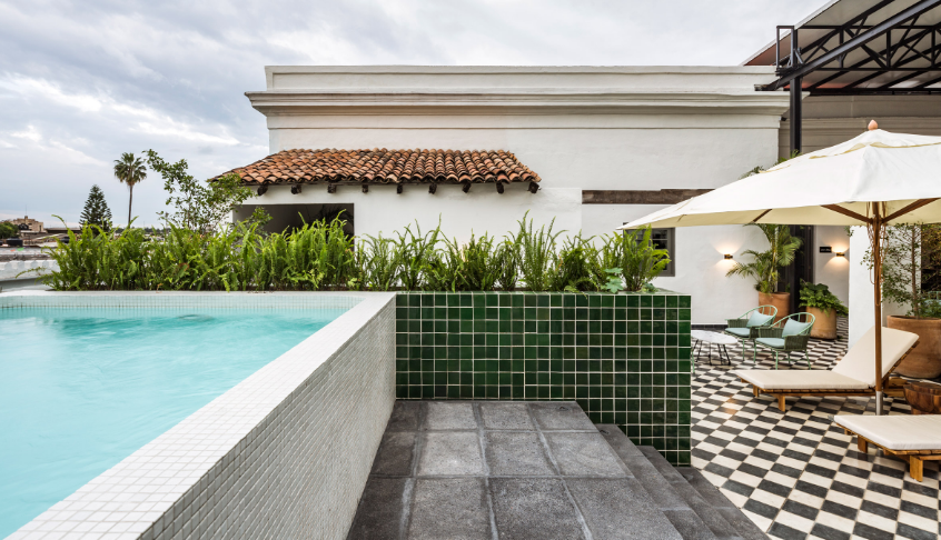 酒店裝修翻新的屋頂露臺(tái),同時(shí)擁有一個(gè)酒吧與蔚藍(lán)家具和戶(hù)外游泳池與Tlaquepaque的著名教堂穹頂?shù)那熬啊?/div>